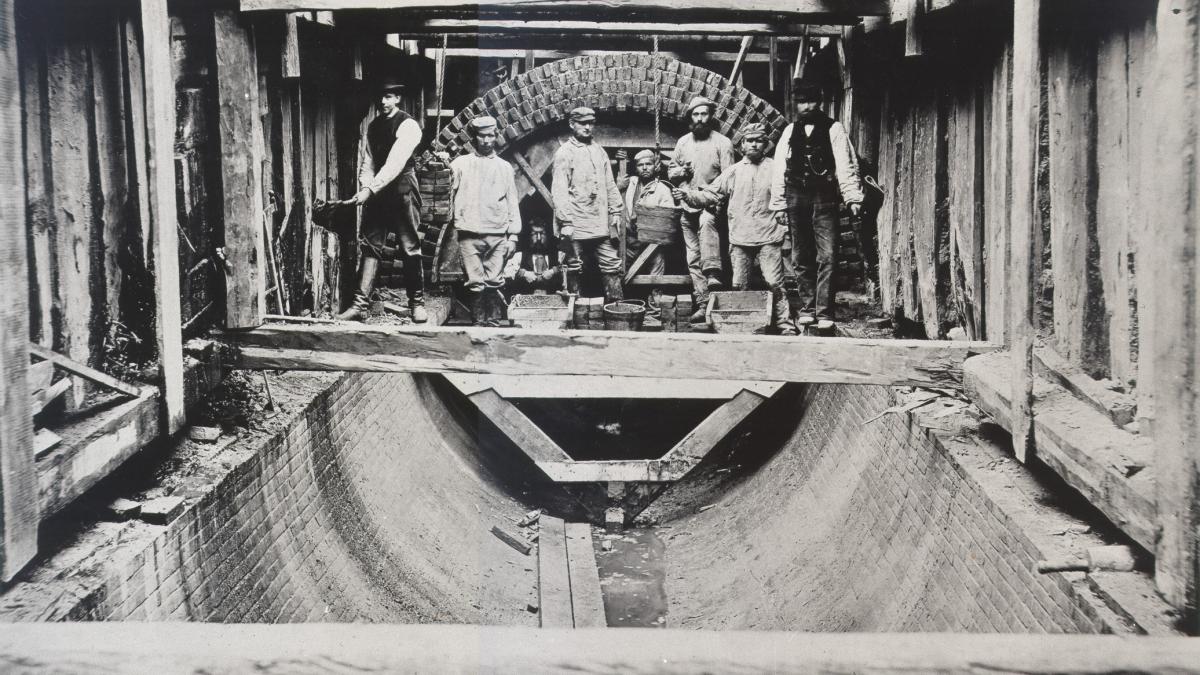 Відведення вод було першорядним завданням. Першу каналізацію заклали 1842 року. В експлуатацію її ввели за рік. Вона була алювіального типу. Він був найпоширеніший у Європі. Алювіальний принцип роботи каналізації полягав у тому, що стічні, дощові, побутові води змиваються у річку. Відсутні резервуари зі стічними водами. За рахунок чого не було неприємного запаху містом у літню пору. Досвід Англії у тому, що брудні води прибиралися з вулиць. Але вони продовжували зберігатися і неприємно пахнути вже з-під землі.